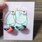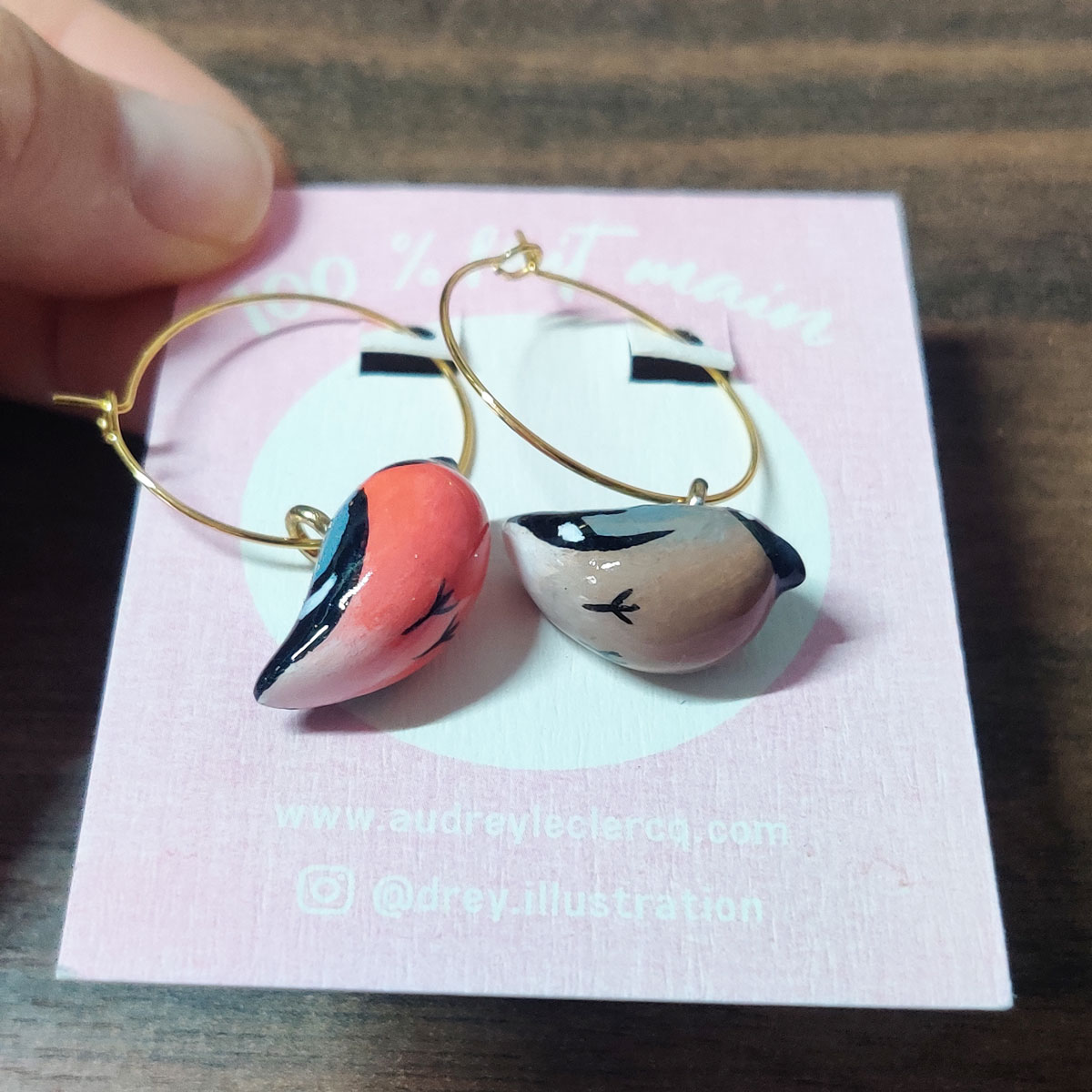 Boucles d’oreilles uniques, chaque oiseau est modelé, peint puis vernis (résine UV) à la mains.