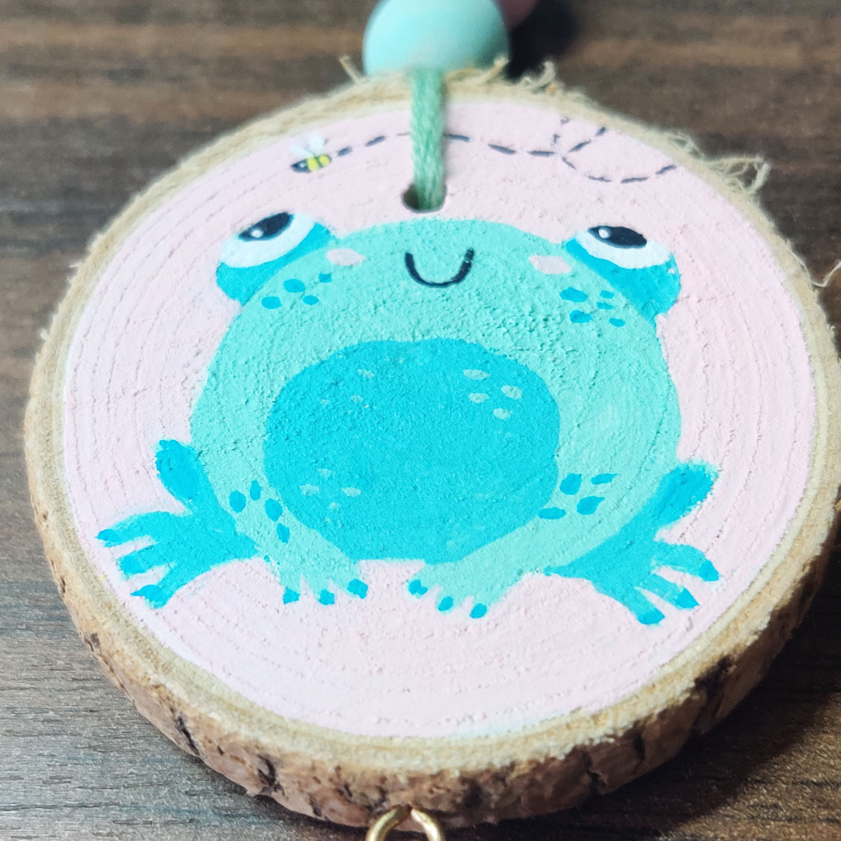 Rondin en bois peint à la mains avec son petit pompon et ses perles.